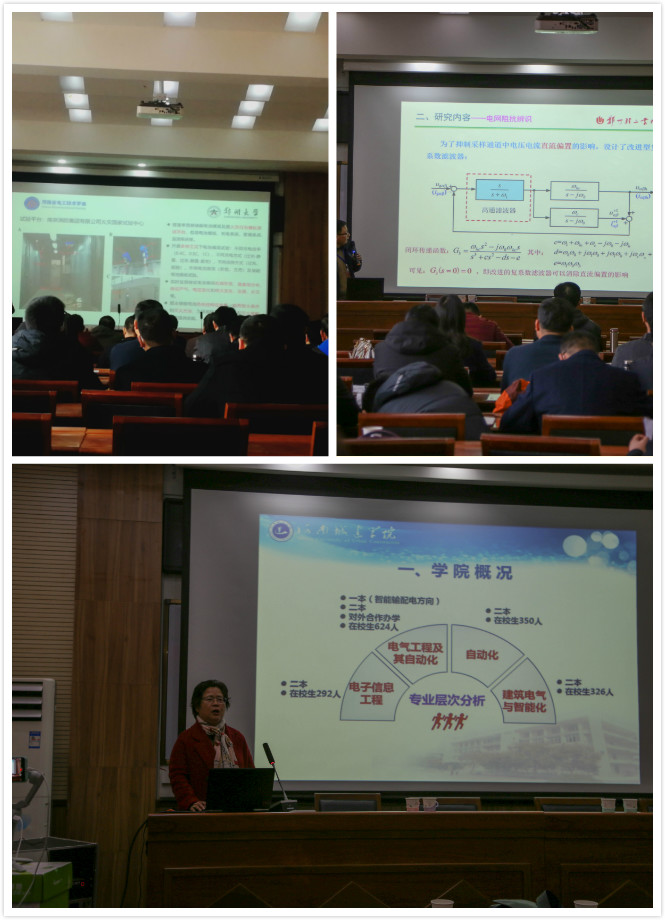 在学术年会上,与会嘉宾围绕年会主题,分别作了学术报告。其中郑州大学金阳博士作了《锂电子电池储能电站早期安全预警》、中原工学院闫李博士作了《多模态多目标复杂进化算法的研究及应用》、郑州轻工业大学郭磊磊博士作了《弱电网下风电变流器的阻抗自适应双模式并网运行控制研究》等学术报告。樊晓虹教授代表河南城建学院做专题报告,她简要地介绍了我校发展的基本概况、发展思路、发展目标以及电气与控制工程学院发展的历程、办学经验与成效等。她表示,河南城建学院愿意和各兄弟院校一起,凝心聚力,为电气学科的建设和发展出谋划策,为服务行业进步和地方经济社会发展做出新的更大的贡献。