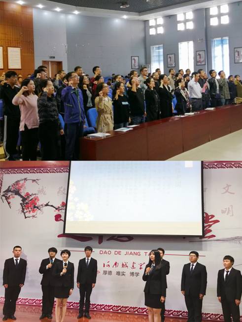 首先,全体成员在《公民道德歌》的音乐声中反省自身,唱歌曲环节中大家齐唱歌曲《诚信中国》;紧接着由副院长孙炳海教授带领教师重温了《教师誓词》,然后进行了学生诚信誓词宣誓。诵经典环节,师生通过诵读《弟子规》深刻感悟诚信,并在感动中原“王喜云”短片中感受诚信魅力;发善心环节,邀请了校“师德标兵”任琦梅老师和学生代表霍晨阳和姜平等进行了演讲,把整个活动推向高潮,使师生了解到诚信在工作、生活和学习中的重要性,对每一个人的影响都是深渊的。在“送吉祥”环节中,通过发放印有名言警句的精美书签,让大家感受中国诚信文化。