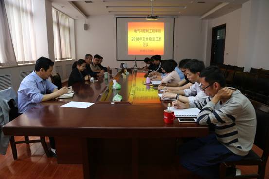(通讯员 贺伟) 4月28日下午,电气与控制工程学院召开2018年安全稳定工作会议,学院班子成员、教研室主任、实验中心主任、科研班主任、教务办主任、党政办主任、团学办主任、各党支部书记和全体辅导员等参加了此次会议,会议由赵静生书记主持。