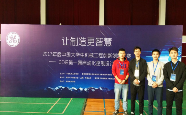 (通讯员 宋伟)10月21日,由中国机械工程学会和教育部高等学校机械类专业教学指导委员会主办的2017年度GE杯第一届自动化控制设计大赛在南京金陵科技学院举行。经过第一轮的激烈竞争共有20支参赛队伍最终突出重围进入到全国总决赛环节。由我校电气与控制工程学院教师孙炳海、宋伟指导,学生何越宙、孙昊、郭杰组成的“智慧水控”团队完成的作品“浮筒式水处理装置控制系统”,通过现场系统演示、理论知识考核及现场答辩环节的三个环节的激烈角逐,最终荣获一等奖,同时我校获得优秀组织奖。