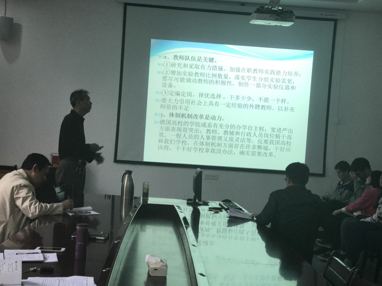 赵静生结合在德国的考察培训,做了详细的报告,报告内容强调,第一点:应重视应用科学研究及工程交叉学科的发展,培养各行各业的操作型工程师、管理人员及社会工作者;第二点:转型就是把办学思路真正转到服务地方经济社会发展上来,把办学定位转到培养应用型技术技能型人才上来,转到增强学生就业创业能力上来,把办学模式转到产教融合校企合作上来;第三点:教师队伍是关键,加强在职教师实践能力培养,增加实验教师比例数量,调动教师积极性,推出自主制作实验仪器和设备。大力引进社会上具有一定工程经验的外聘教师;第四点:教学改革是主体,通过教学模式改革,在教学内容、教学方法、理论与实践的有机融合、教材的使用、教学手段的配合等方面加以落实;第五点:加强对外合作和交流,允许和鼓励教师在业余时间企业、行业兼职或进行技术服务,为教师提供在企业行业实践的空间。引进和培育攻关团队,在绿色节能建筑项目、电力输出项目、工业制造、物联网项目等方面探索研究,不断积蓄实力,争取早日开花结果。