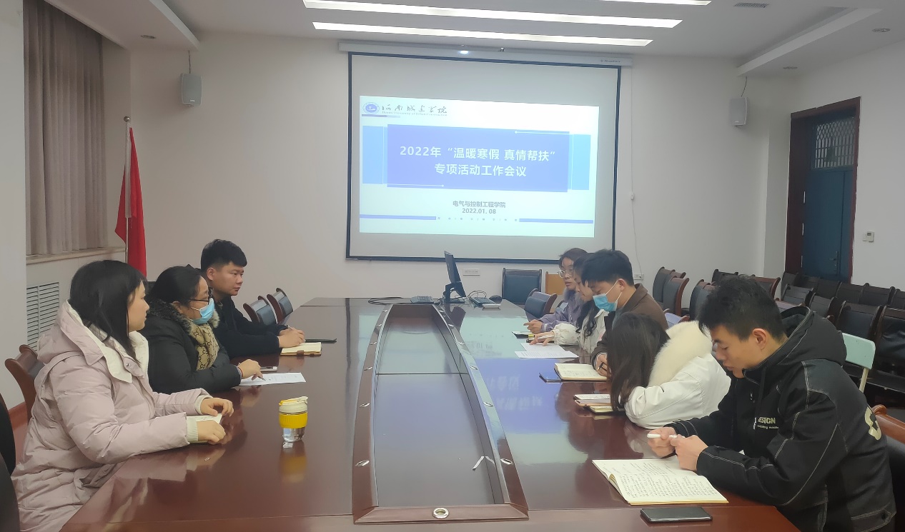 (通讯员 吴雨泽)为深入宣传国家、学校的资助政策,2022年1月8日,电气学院在B313会议室召开电气学院2022年“温暖寒假 真情帮扶”专项活动工作推进会,学院党委副书记宁蕴绯、团总支书记暨学工办主任徐娟、团总支副书记暨学工办副主任陈伟、学院资助专员以及全体辅导员参加了此次会议,会议由陈伟主持。