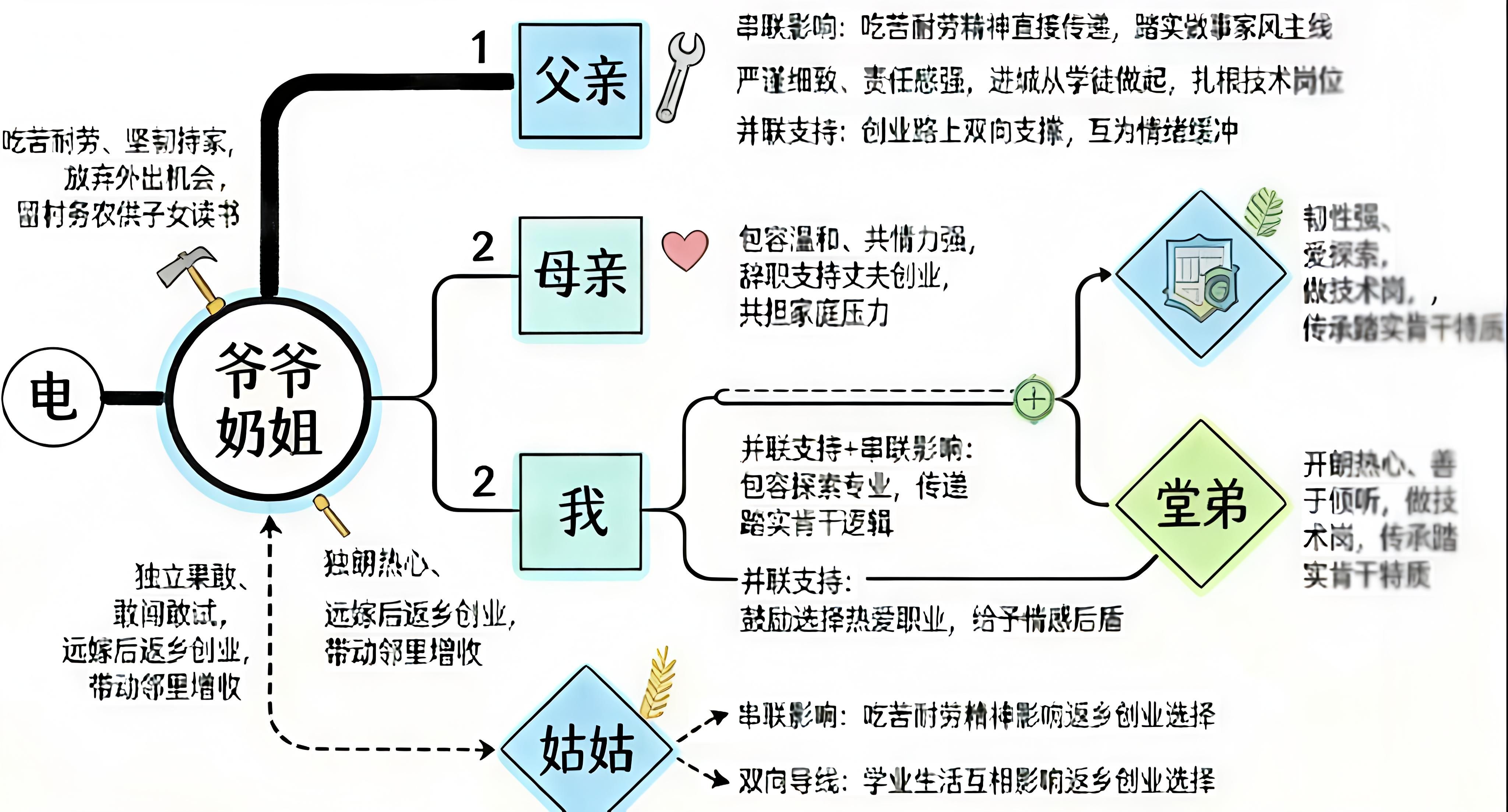“家谱新绘”活动鼓励同学们绘制一份创意家谱,不仅记录血缘关系,更可邀请家人共同标注每位成员的个性特点、重要人生选择(如同“电路节点”),并用线条(“导线”)描述成员间的情感联结强度与支持方式(如“并联支持”或“串联影响”)。活动中,同学们化身家庭故事的记录者与传承者,以电路节点、导线创意呈现家人特质与情感联结,在绘制中理解代际影响、增强家族归属感。