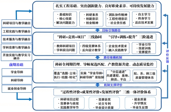 建立“过程性+成果性+发展性”三维一体评价体系。过程性评价动态监控科研、竞赛、实践等环节;成果性评价检验竞赛获奖、论文专利、毕设质量;发展性评价跟踪就业、升学、毕业生反馈。