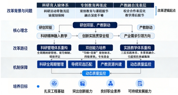 以科教融汇为核心,建立“学院统筹-系部监管-导师负责”三级体系,出台专项管理办法,明确各方“以研促教、以教带研”权责。将教师科研项目与教学训练绑定,通过“选题-立项-中期-结题”全周期跟踪,推动科研与教学深度融合。